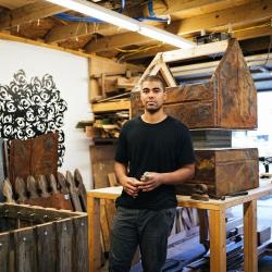 North Charleston, SC, native and resident Fletcher Williams III (b. 1987) has shown his work in more than two dozen exhibitions since receiving his BFA at New York’s Cooper Union in 2010. Among the mixed media artist’s five solo exhibitions are Traces at 701 Center for Contemporary Art in Columbia, SC, in 2018 and Promise Land in 2020 at the historic Aiken-Rhett House in downtown Charleston, SC. The latter was a venue-wide exhibition in which Williams engaged the urban plantation’s grounds and indoor spaces with his paintings, sculptures and installations. Among the group shows that included Williams’ work are those at the Museum of Contemporary African Diasporan Art, the Caribbean Cultural Center and Cooper Union, all in New York City; Gateway Project Spaces in Newark, NJ; the San Diego Museum of Contemporary Art + African American Museum of Fine Art in California; the Mint Museum and Hodges Taylor Gallery in Charlotte, NC; the Mann-Simons Site and McKissick Museum in Columbia, SC; and several venues in Charleston and elsewhere in South Carolina. At the Mint Museum, Williams was included in Coined in the South, a 2019–2020 overview of art in the US South. Williams’ work is in the permanent collection of Charleston’s Gibbes Museum, where he was a visiting artist in 2019. He worked on the set of the Amazon Prime series The Underground Railroad, and his work has been discussed in some two-dozen publications, including the Wall Street Journal and the New York Times.